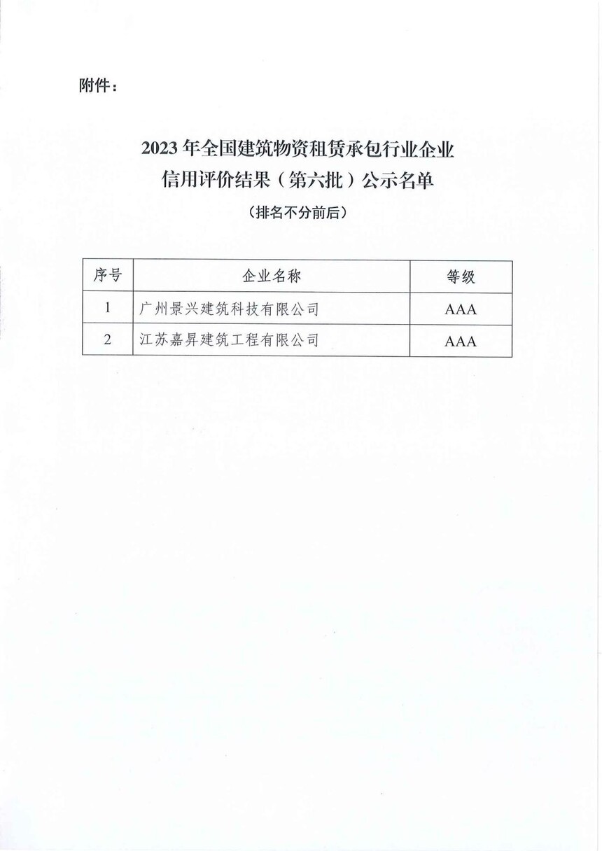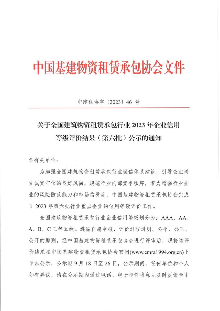 关于全国建筑物资租赁承包行业2023年企业信用等级评价结果(第六批)公示的通知